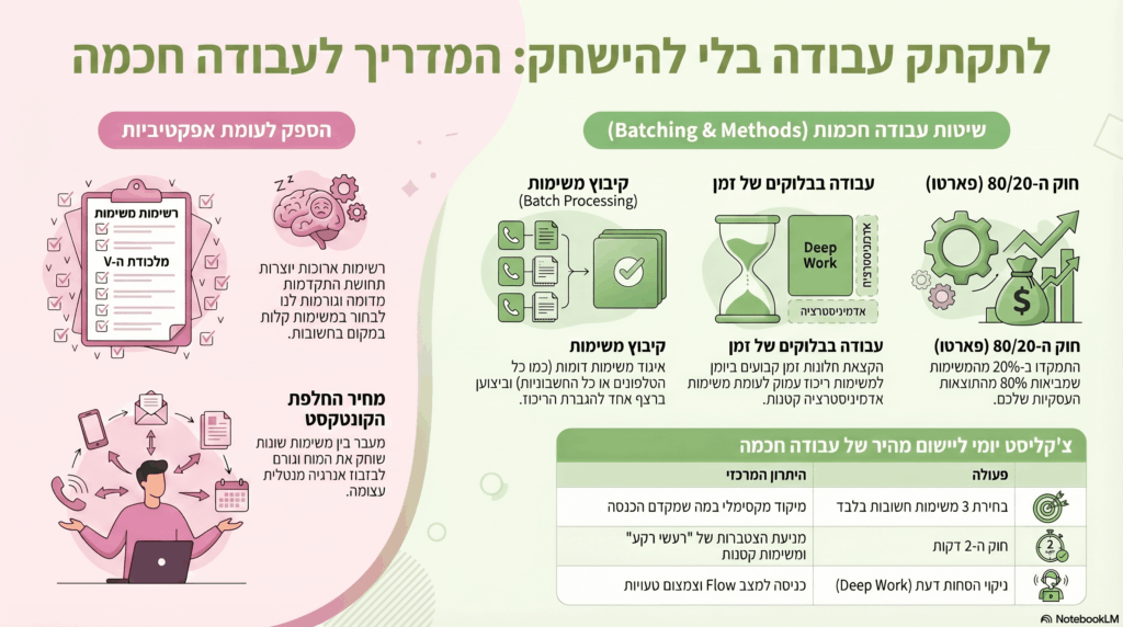 להשתמש בכלים דיגיטליים, לקבץ משימות דומות ולתעדף לפי השפעה.
